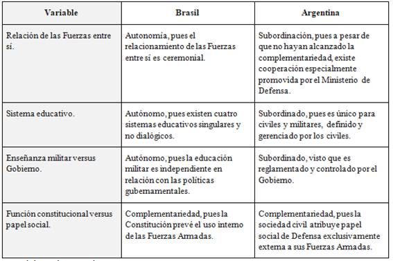 Los casos argentino y brasileño se analizarán utilizando la matriz compuesta por los cuadrantes descritos como referencia y, dependiendo de la respuesta para cada variable, se podrá hacer en cada cuadrante una evaluación en el sentido de aquel caso ser democrático o no. Luego, por medio del análisis comparativo entre los ejemplos, será posible establecer el grado de democratización logrado para estos países, tomando como principio que la mejor manera de entender cómo las Fuerzas Armadas se integran a la democracia es evaluando cómo inculcan sus propios valores de este régimen, proceso que es introducido por las reformas en la educación de los militares.