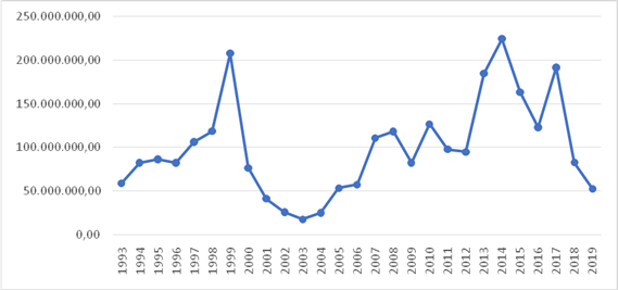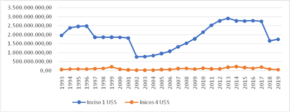 El presupuesto de la “función Defensa”13 para 2019 fue de 71042’483247 millones de pesos argentinos, mientras que el del Ministerio de Defensa ascendió a 102838’290570 millones de pesos. Esto significa en términos nominales un aumento del 24,98% y del 25,83%, respectivamente entre 2018 y 2019. Tomando como base USD1 dólar a 40 pesos para 2018 y a 49,25 pesos para 2019,14 el presupuesto de la “función Defensa” ascendería a USD1442’486969,48 de dólares entre los años mencionados; es decir, un aumento del 1,51%. En cuanto al gasto del Ministerio de Defensa, pasaría a USD2088’087118; es decir, un aumento de apenas 2,20% entre 2018 y 2019.