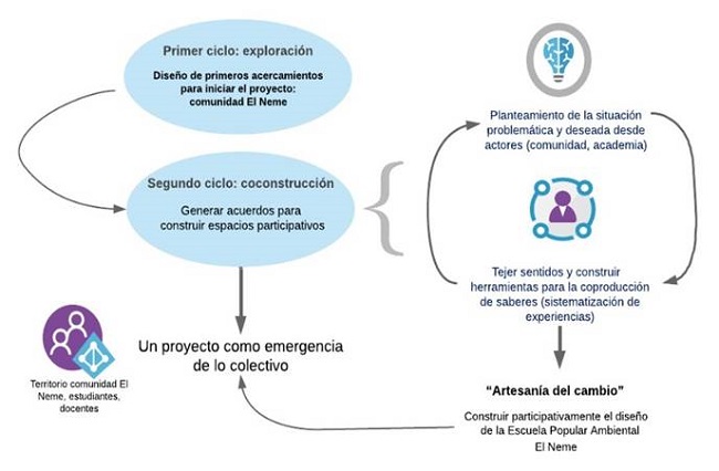Durante los primeros encuentros se codiseñaron espacios participativos conjuntamente con la comunidad identificando potencialidades, obstáculos y oportunidades para la organización comunitaria alrededor de la idea “semilla” de una Escuela Popular Ambiental, entendida como una experiencia viva y auténtica. Estos encuentros entre docentes-investigadores y comunidad favorecieron la construcción de sentido y las pautas para la construcción de herramientas de coproducción de saberes. De forma simultánea, los ejercicios de inmersión en campo y los encuentros participativos con la comunidad permitieron una mejor comprensión del contexto y de la situación problemática.