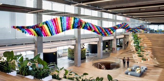 Las nuevas oficinas “hiperconectadas” cuentan con múltiples espacios comunes para promover el trabajo colaborativo: cafés, salones silenciosos adornados con cómodos sillones y almohadones, livings y terrazas verdes. Los trabajadores y las trabajadoras pueden realizar sus labores en escritorios compartidos, en salas de reunión o en zonas de descanso. Según los proyectistas, se trata de “una reinterpretación del concepto de ‘escalera social’ mediante un sistema de gradas que comunican los pisos en forma democrática y dinámica, distinta al clásico diseño lineal” (Baldo 2019, s/p).