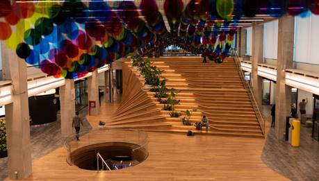 No hay rincón que no invite a la contemplación. Si se mira hacia arriba, se percibe una enorme estructura con pequeños círculos de colores que cuelgan desde gran altura, como puede apreciarse en la imagen 1.