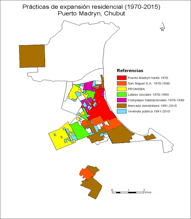 En el crecimiento sostenido iniciado en los años 70, en términos demográficos y urbanos, predominaron prácticas excluyentes de acceso al suelo y a la vivienda para ciertos sectores sociales. Estas prácticas no eran nuevas: estuvieron presentes desde los orígenes de la ciudad alrededor de 1889. Kaminker (2016) señala que en los primeros años de su fundación fueron la iniciativa privada y la rentabilidad de la venta de tierras los factores que impulsaron la lenta expansión urbana. La llegada del ferrocarril, por un lado, posibilitó un asentamiento estable en Puerto Madryn y, por otro, que las condiciones de los contratos de concesión y las propiedades otorgadas a la empresa sentaran las bases para el control privado del mercado de tierras urbanas y rurales cercanas al pueblo. Como señala este autor “el hecho paradigmático fue que la empresa que loteaba planificara la forma que tendría la ciudad y su trama en 1906” (Kaminker 2016, 45).