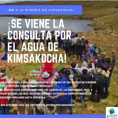 La pregunta fue la siguiente: ¿Está usted de acuerdo con que se realicen actividades mineras en los páramos y fuentes de agua del sistema hidrológico Kimsacocha (Quimsacocha)? Sí/No. La campaña publicitaria de la consulta popular se centró en el cuidado del páramo, un ecosistema hidrológicamente importante, conjugándolo con el rol espiritual que cumple el agua en su interrelación con las comunidades andinas. El páramo de Quimsacocha se constituyó como territorio hidrosocial en disputa, al que se lo defiende no solo como contenedor de agua, sino como productor de esta, y como tal su defensa devino en un derecho (Vargas y Sánchez 2017).