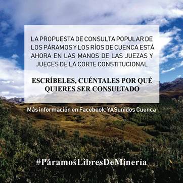 La vía judicial es fundamental. Ahora eso depende de jueces que no se dejen vender y le dan fallo a favor de la minería, en contra del pueblo. Sabemos que en nuestro caso hubo un juez que realmente se puso la mano en el corazón y entendió por lo que estamos luchando por nuestros derechos. Nosotros no queremos minería en nuestros páramos por las irregularidades que hizo la empresa. Ha sido un logro, pero ahora depende de la Corte Nacional, que constaten las afectaciones en Río Blanco (entrevista a comunera de Río Blanco, 30 de abril de 2021).