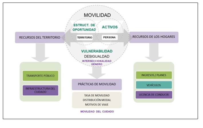 Para la investigación en la que se basa este artículo, se ajustó el enfoque AVEO a fin de adaptarlo al estudio de la movilidad en el SiMeT, considerando la perspectiva de género. En la figura 1 se presenta gráficamente dicha adaptación del enfoque, en el cual la relación entre movilidad y desigualdad se expresa como la interacción entre los activos de las personas (planes, vehículos, licencia de conducir) y las estructuras de oportunidades del territorio (transporte público e infraestructura de cuidados).