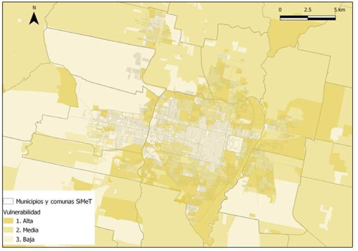 La caracterización de zonas de vulnerabilidad para el caso de Tucumán (OFUT, ERSEPT e IDET 2018) supuso un enfoque multidimensional sobre las privaciones socioeconómicas de la población y su interacción con el espacio geográfico. A partir del análisis de variables censales vinculadas a las dimensiones educación, estructuras de población, deficiencias en la vivienda y pobreza, se identifican tres tipos de vulnerabilidad: 1) alta, 2) media y 3) baja.13
