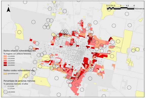 En aproximaciones recientes desde la articulación vulnerabilidad, género y cuidados, se advierten las áreas más tensionadas por la confluencia de diferentes variables desde esta lectura interseccional. En la figura 4 se muestran las áreas de vulnerabilidad alta en los radios urbanos del SiMeT, clasificadas según porcentajes de hogar con jefatura femenina. El análisis de la jefatura de hogar femenina se asume como un indicador de aproximación a los cambios socioculturales de género, en tanto se refiere a quien declara ser jefe/a del hogar. Ello da cuenta de tres dimensiones: una material, en relación con los niveles de ingreso e inserción laboral, una sociocultural y una política. Tanto en Tucumán como en Argentina y la región latinoamericana, se manifiesta una tendencia en aumento (Czytajlo 2017). Por otra parte, en la imagen se grafican, mediante símbolos graduados, los porcentajes de población menor a 15 años, como indicador de la demanda material de cuidados mayoritariamente a cargo de mujeres.