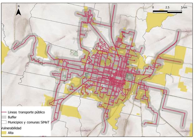 bitantes del espacio metropolitano. Si bien refleja un alto porcentaje de población cubierta, se observan problemas de conectividad que se corresponden con las zonas más pobres, con carencias en la vivienda y con menor cobertura de servicios. Las líneas urbanas e interurbanas compiten entre sí y generan, por un lado, sobreoferta, ya que casi todas pasan por el centro de la capital y, por otro, dejan zonas del territorio sin cobertura. Los recorridos de las líneas se cruzan con la información sobre las zonas vulnerables del SiMeT y permiten detectar que las zonas más desfavorecidas tienen menor opción de transporte. Los desplazamientos entre puntos distantes de la periferia demandan transbordos y mayores tiempos de viaje, evidenciando las desigualdades socioterritoriales en torno a la posibilidad de uso del transporte público.