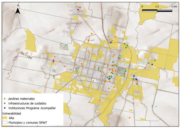 La infraestructura de cuidados implica no solo dispositivos de atención de personas dependientes (menores, mayores, con discapacidad), sino también de atención a las violencias y las condiciones del entorno cotidiano, si se asume la noción de cuidado como “responsabilidad colectiva” que pone en discusión tanto el reconocimiento y la visibilidad de las funciones de cuidados como la redistribución de las mismas. Se analiza la oferta de jardines materno-infantiles, oficinas de atención de problemáticas de violencia de género (instituciones Programa Acompañar)15 y centros de cuidados (albergues para mujeres, refugios, centros integrales comunitarios). En la figura 6 se observa que estas infraestructuras se encuentran centralizadas en el municipio de San Miguel de Tucumán y, en menor medida, en las zonas de baja vulnerabilidad del resto del espacio metropolitano. Las zonas de alta vulnerabilidad se encuentran a mayores distancias y, por tanto, disminuye su accesibilidad a estos servicios a pesar de lo esenciales que resultan en relación con la demanda (figura 4).