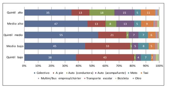 Las mujeres y los hombres se desplazan por la ciudad de manera diferente, debido a los distintos tipos de tareas que realizan cotidianamente. En general, las mujeres hacen mayor uso del transporte público y de la caminata, mientras que los hombres emplean principalmente el vehículo privado (Granada et al. 2016; Col·lectiu Punt 6 et al. 2021; Sánchez de Madariaga 2004). Al analizar la distribución modal del SiMeT, se identifica que el 36 % de la población se desplaza en colectivo, 22 % a pie, 18 % en auto, el 14 % en moto, el resto lo hace en bicicleta, taxi y otros. Al desagregar por género, se observa que las mujeres del SiMeT realizan el 70 % de sus viajes en colectivo y a pie, mientras que los hombres lo hacen en un 46 %. Los 49 hombres realizan más viajes en vehículos privados motorizados que las mujeres (37 % en auto y moto). Esto se debe principalmente a que cuando el hogar cuenta con vehículos las mujeres no suelen disponer de estos, además de que no cuentan con licencia de conducir. En un enfoque interseccional, se analizan las condiciones de movilidad de las mujeres según los distintos quintiles (gráfico 2). Se detecta que todos los quintiles hacen uso del transporte público, pero este es mayor para los quintiles medios, que representan más de la mitad de los viajes. La caminata a pie constituye la forma de desplazamiento principal para los quintiles más bajos -casi la mitad de los desplazamientos-, único quintil donde el transporte público no es el principal modo de viaje. El uso del auto es muy escaso en los quintiles más bajos y aumenta a medida que los ingresos son mayores. Las mujeres tienden a usar el auto más como acompañantes que como conductoras en todos los quintiles, salvo en el más alto, donde más mujeres son conductoras y disponen de vehículo en el hogar.