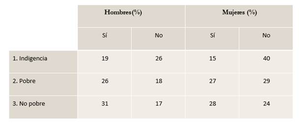 Se relevaron 1 440 045 desplazamientos por día en el SiMeT que son efectuados por el 58% de la población mayor a 3 años, el día hábil anterior a la encuesta. El promedio de la tasa de generación de viaje para todo el espacio metropolitano es 2,46 por día, considerando a las personas que realizan al menos uno por día. Las tasas de generación de viaje de los aglomerados más grandes de Argentina son las siguientes: Buenos Aires 2,37; Córdoba: 2,47; Rosario 2,53 y Mendoza 2,33. Al analizar la producción de viajes de la población total según su “situación de bienestar”,19 se detecta que realizan desplazamientos el 34 % de las personas de hogares indigentes, el 53 % de las personas de hogares pobres y el 59 % de hogares no pobres. A menores ingresos hay menos posibilidades de que las personas concreten viajes. Al desagregar esta información por género (tabla 1), se encuentra que las mujeres con menores ingresos viajan menos aún que los hombres de su mismo nivel de ingresos.