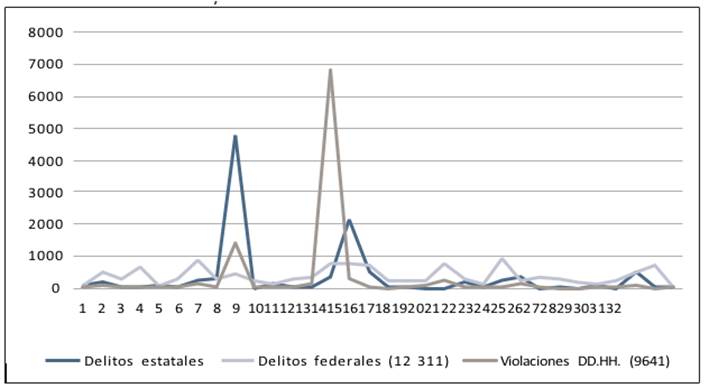 La inconsistencia en los datos reportados puede explicarse como resultado de distintos factores. Hay entidades que reportan cero delitos o actos violatorios a los DD. HH. no porque no tengan lugar, sino porque las personas afectadas no los denuncian o las autoridades no los reportan e investigan. La cifra negra que en general tiende a ser muy alta en promedio (92,4), se traslada a la denuncia del crimen ambiental y las autoridades no consideran prioritarios los delitos ambientales en tanto el universo de casos es estadísticamente reducido en comparación con los delitos que impactan en mayor grado a la ciudadanía.8