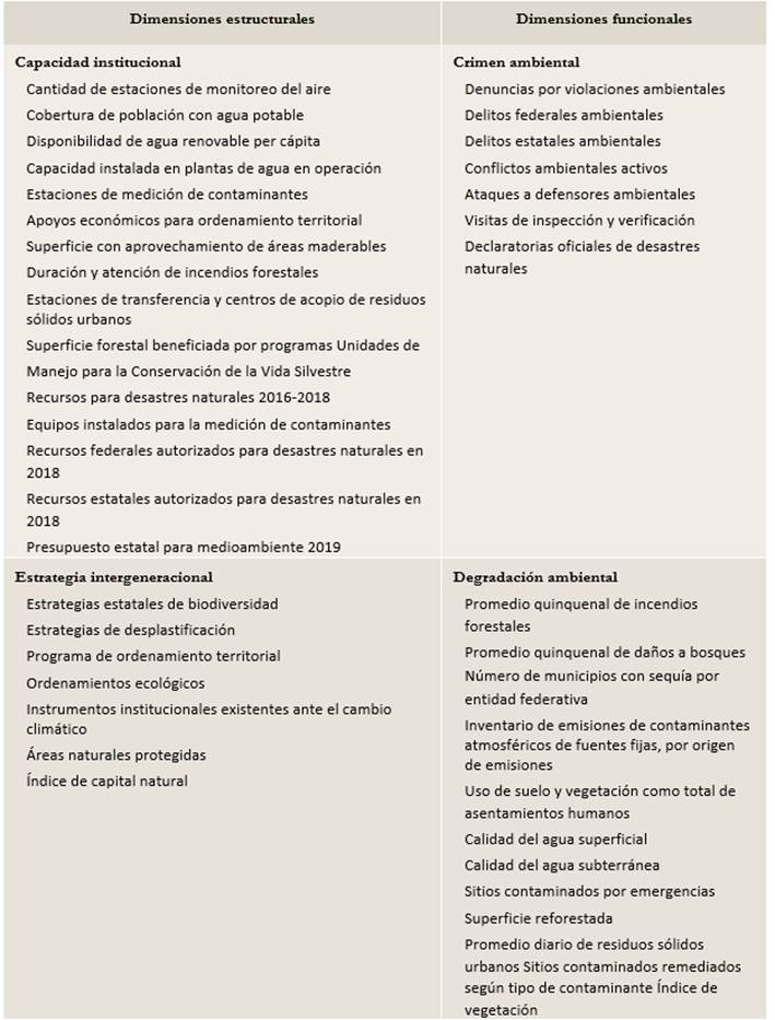 Desde un enfoque que se nutre de la justicia ambiental, la criminología verde y el reconocimiento del derecho al medioambiente sano, tenemos en cuenta los siguientes aspectos para definir impunidad: i) la imposibilidad de investigar, perseguir, enjuiciar, sancionar y reparar los delitos y daños en contra del medioambiente; ii) el incumplimiento de objetivos de política ambiental y climática; y iii) la inexistencia de estrategias y programas de políticas públicas de largo plazo o intergeneracionales Cedillo y Le Clercq 2021). La problemática del delito y daño ambiental va más allá de las contravenciones tipificadas en las leyes, por lo que el IGI-AMB integra 42 indicadores concentrados en cuatro dimensiones analíticas con un peso idéntico en el modelo: capacidad institucional (estructural), degradación ambiental (funcional), crimen ambiental (funcional) y estrategia intergeneracional (estructural).