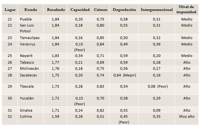 Los resultados señalan que el desempeño en todos los estados se encuentra muy por debajo del puntaje máximo alcanzable (4 puntos). El promedio nacional es 1,93 mientras Durango alcanza 2,31 y Colima solo 1,59. Esto significa que la política ambiental en México tiende a ser institucionalmente débil, que no se cuenta con las suficientes capacidades institucionales para proteger ecosistemas, evitar la degradación de recursos y capital natural o condiciones para garantizar el disfrute efectivo del derecho a un medioambiente sano establecido en la Constitución.2