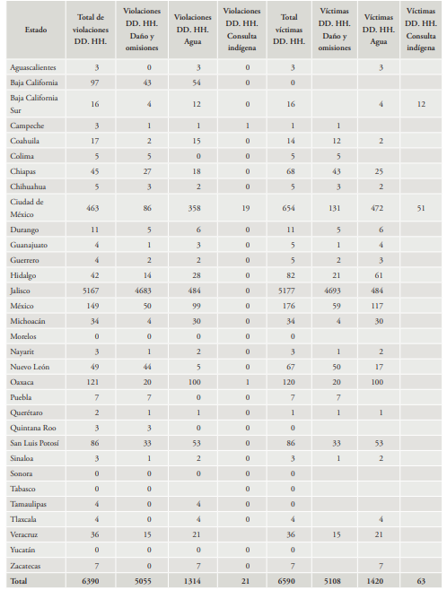 Los actos que causaron daño ambiental y omisiones de las autoridades ante este tipo de eventos representan 79 % de las violaciones a DD. HH. reportadas durante 2019, seguidas por violaciones al derecho humano al agua, en 20 %, y violaciones al derecho a la consulta a pueblos indígenas en 20 casos. Integramos violaciones al derecho a la consulta a pueblos indígenas por su relación con el desarrollo de megaproyectos o la autorización para la extracción de recursos naturales o minerales en sus territorios. La variación entre los casos reportados evidencia también los problemas de consistencia, pues mientras en Jalisco reporta 5167 actos violatorios a derechos ambientales, el 80 % del total, en 18 estados el reporte es menor a diez actos violatorios y en cuatro de estos es igual a cero (ver tabla 4).
