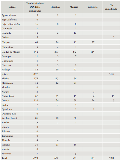 La proporción entre actos violatorios a derechos ambientales y el total de víctimas se reduce a 1,03 víctimas por acto violatorio reportado, lo cual no refleja efectivamente el impacto real en el total de afectados ambientales. Dejando de lado la información correspondiente a Jalisco ante el sesgo que produce, donde además no se identifica el género o el carácter individual o colectivo de las víctimas, el resto de las 1413 víctimas se distribuyen en 48 % hombres, 38 % mujeres, 12 % grupos colectivos y solo el 2 % no se identifican (ver tabla 5).
