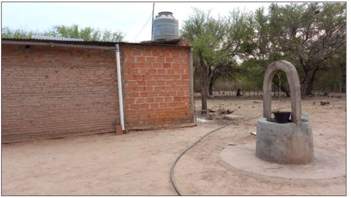 En el año 1973, con fondos recolectados a partir de la recaudación monetaria y la mano de obra de las propias familias de la comunidad, se consigue realizar la perforación del suelo y construir el primer jagüel7 para obtener y almacenar agua de las napas subterráneas, las cuales luego eran baldeadas8 con tracción animal. Posteriormente, en el año 2005, se construye (ya a partir de la organización política como Mo.Ca. Se) el primer pozo surgente comunitario con redes de distribución hasta los distintos hogares y los primeros aljibes con cisterna para almacenar agua de lluvias en las casas (ver ejemplos de este tipo de construcciones en las figuras 1 y 2).