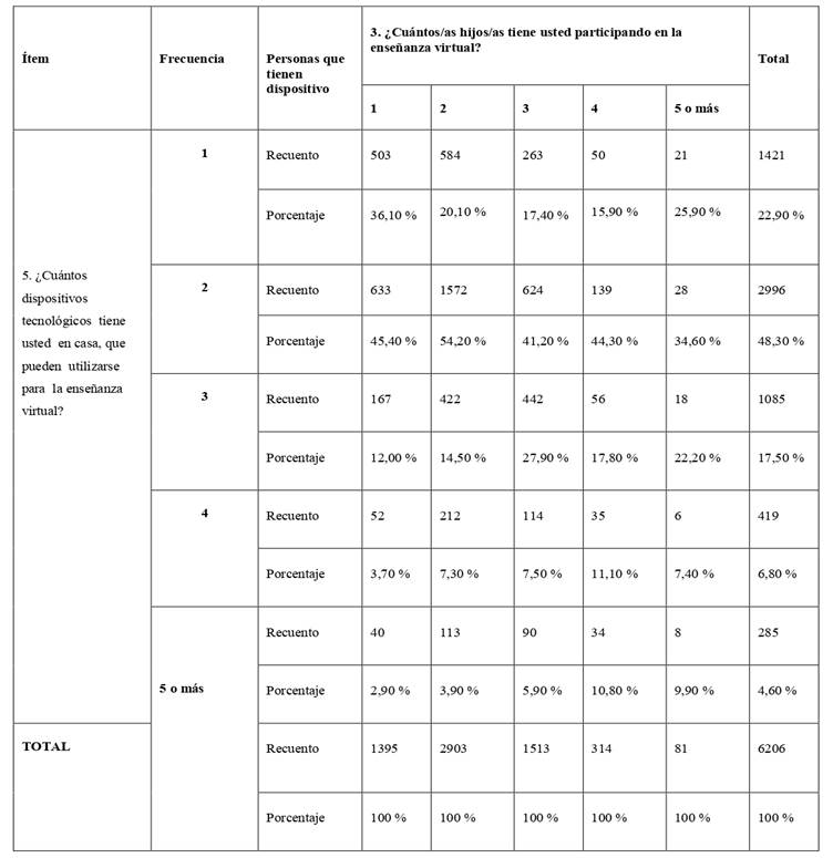 La consulta sobre el número de dispositivos tecnológicos utilizados en casa para la enseñanza virtual en proporción con el número de hijos e hijas consta en la tabla 3.