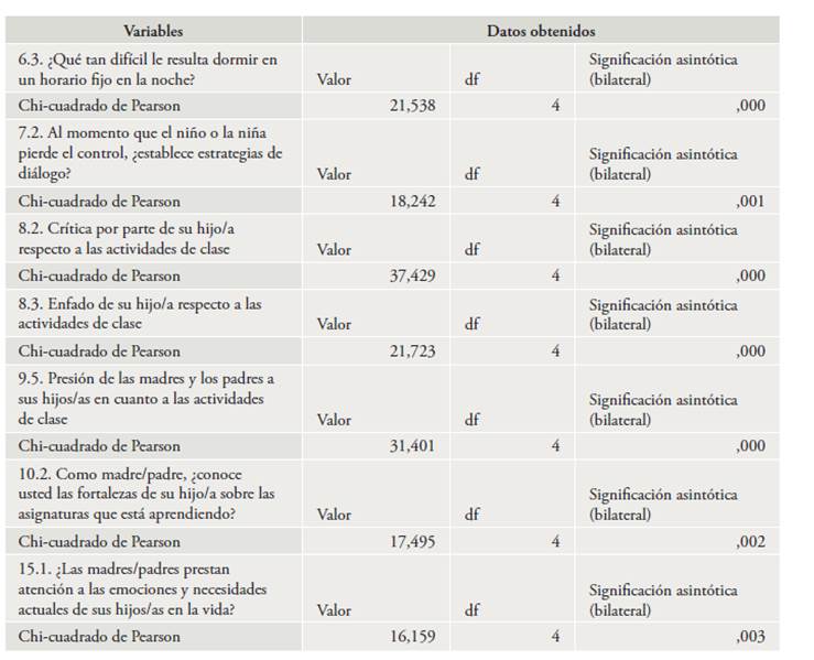 6.3. ¿Qué tan difícil le resulta dormir en un horario fijo en la noche? 7.2. Al momento que el niño o la niña pierde el control, ¿establece estrategias de diálogo? 8.2. Crítica por parte de su hijo/a respecto a las actividades de clase 8.3. Enfado de su hijo/a respecto a las actividades de clase 9.5. Presión de las madres y los padres a sus hijos/as en cuanto a las actividades de clase 10.2. Como madre/padre, ¿conoce usted las fortalezas de su hijo/a sobre las asignaturas que está aprendiendo? 15.1. ¿Las madres/los padres prestan atención a las emociones y necesidades actuales de sus hijos/as en la vida?