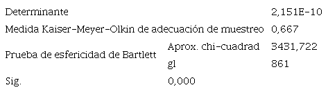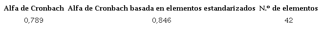 La fiabilidad de los 42 ítems demuestra que el cuestionario contiene un coeficiente que se aproxima a 1, por ende, se puede considerar que la escala cumple con una consistencia interna. En cambio, para la validez, el determinante de la matriz de correlaciones arrojó un valor 0, lo que indica que el grado de intercorrelación de las variables es muy alto. Este valor fue confirmado por la significatividad asociada al test de esfericidad de Bartlett, que es 0,000, por lo que se pudo rechazar la hipótesis nula de correlación entre variables. También el KMO lanzó un valor superior a 0,753, de ahí que, según este indicador, la matriz de datos resulta apropiada para realizar sobre ella la factorización. Específicamente, se calcularon valores de agrupación y peso de cada variable a través de la diagonal de la matriz de correlación antimagen procediendo a discriminar aquellas alejadas a 1 y cercanas a valores negativos. De tal procedimiento resultó la extracción de las siguientes preguntas por falta de homogeneidad grupal:
