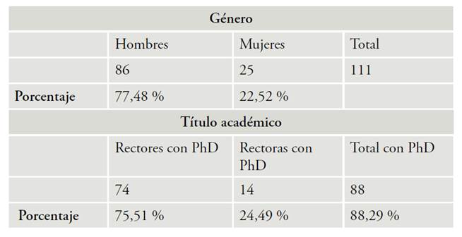 Analizando a las universidades por tipo de financiamiento, se obtiene que de las 25 mujeres rectoras, 13 dirigen universidades públicas y 12 no públicas (privadas o cofinanciadas); pero si tomamos en cuenta que las universidades públicas son 1,54 veces más, en relación con el número de no públicas (tres públicas por cada dos privadas), la probabilidad de encontrar una rectora en universidades públicas con respecto a una privada es de apenas 0,7. Esto indica que hay una mayor apertura en el ámbito educativo privado para tener rectoras, incluso incluyendo a las universidades que necesariamente son dirigidas por hombres (universidades católicas con un como rector) y son cofinanciadas (privadas con ayuda del Estado). En estos casos, la promoción de la paridad o recorte de brechas tiene menor apertura en las instituciones de educación superior públicas.