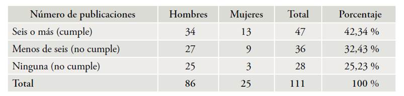 A través de un barrido simple usando las bases de Google Scholar y Scimago, se verificaron las publicaciones de rectores y rectoras. Partiendo del número de publicaciones mínimas para el cumplimiento de la norma, apenas el 42 % la cumple (tabla 2). De entre quienes cumplen, todos tienen título doctoral, por lo que las personas que no se atienen al requisito de título, tampoco cubren el mínimo de publicaciones requerido.