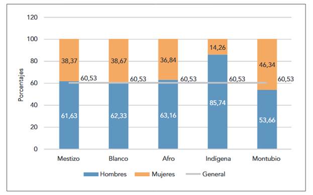 En cuanto a la autoidentificación étnica, por lo general, el porcentaje de hombres autoidentificados como mestizos, blancos y afrodescendientes es ligeramente superior al porcentaje general de los hombres. En el caso de los hombres autoidentificados como indígenas es muy superior al porcentaje general de los hombres, lo que implica que la existencia de mujeres indígenas con algún tipo de cargo directivo es casi marginal. Únicamente para el caso de las personas autoidentificadas como montubias hay una mayor paridad y las mujeres superan el umbral del 40 % (figura 1).