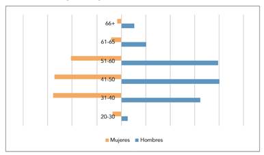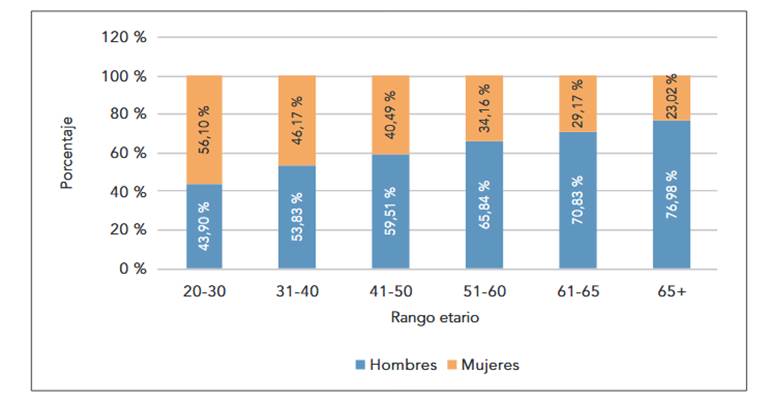 Figura 2. Hombres y mujeres en cargos universitarios intermedios, según rango etario