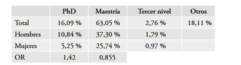 En general, además de la concentración relativa de hombres en mandos medios, también es algo que se observa en las titulaciones más altas. De acuerdo con el odds ratio mostrado en la tabla 3, la probabilidad de encontrar un directivo hombre con doctorado en relación con una mujer es de 1,42; mientras se reduce solo a 0,85 en maestría, lo que indica que las mujeres en cargos intermedios no han podido obtener su doctorado y se concentran más en maestrías. Esto confirma uno de los problemas teóricos planteados en cuanto al techo de cristal. Así, la necesidad de tener doctorado se configura como otro de los problemas para acceder a otro tipo de cargos. Hay que tener en cuenta que los estudios doctorales conllevan alrededor de 4 años, por lo cual es menos probable que las mujeres se inserten en ese tipo de estudios por lo laboral y lo familiar. Incluso entre las generaciones de directivas más jóvenes, los doctorados son todavía menos probables que en hombres. Esta imposibilidad de acceso actual disminuye las probabilidades de que en el futuro la presencia de mujeres en doctorados crezca en la misma magnitud, debido a los requisitos de titulación.