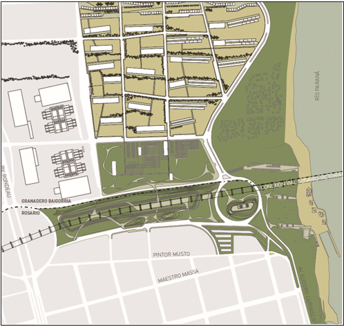Como anticipamos, las primeras propuestas para reformar el área del Remanso Valerio procedieron de capitales privados. Si bien el municipio de Baigorria mostró 47 interés en estas iniciativas, la Municipalidad de Rosario intervino prontamente para abortarlas, generando nuevas herramientas para una planificación metropolitana. En 2007 se propuso la construcción del Parque de la Cabecera (fig. 5) en la convergencia de la Avenida Circunvalación y el puente, precisamente en la zona del Remanso Valerio, entre Rosario y Baigorria.