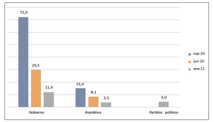 Sobre el segundo problema, la legitimidad que la ciudadanía panameña otorga a la democracia y al sistema en general, varios datos generan preocupación. De acuerdo con las Encuestas de Ciudadanía y Derechos que hace el Centro Internacional de Estudios Políticos y Sociales (CIEPS), solo un 46,8 % de la ciudadanía reconoció la democracia como la mejor forma de gobierno en 2019 y en 2021. Igualmente hay niveles preocupantes de confianza en las instituciones políticas, incluidos el Gobierno, la Asamblea y los partidos políticos. Esto es un problema regional, pero de dimensiones dramáticas para el caso panameño. En la figura 1 se muestra cómo se derrumba la valoración positiva de estas instancias luego de la pandemia.