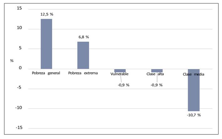 Hacia finales de 2020 ya eran más visibles las consecuencias económicas de la emergencia sanitaria. Panamá sufrió la mayor contracción económica de su historia con un descenso del producto interno bruto (PIB) de 17,9 %. Este dato superó incluso la histórica recesión de 1988 cuando el PIB de Panamá se derrumbó un 13,4 %. La pobreza aumentó un 12,5 % y la pobreza extrema creció 6,8 % en el año 2020, según estimaciones del BID. La clase media se desplomó, encogiéndose en casi un 11 % (figura 2), al tiempo que el índice de Gini aumentó en 3,8 puntos alcanzando el valor de 54,1 (Garcimartín, Freire y Astudillo 2021).