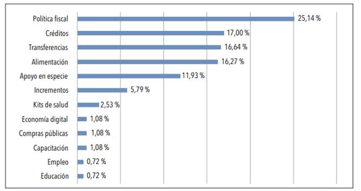 Las 32 agendas políticas están concentradas en intervenciones de política fiscal (25,14 %), como condonaciones o descuentos en el pago de impuestos y otras obligaciones fiscales; en créditos empresariales (17 %) con bajas tasas de interés o descuentos en los pagos; y en transferencias (16,64 %), a través de entregas monetarias directas a personas en situación de vulnerabilidad (figura 1). Otras intervenciones relevantes consisten en la provisión de alimentos (16,27 %) y otros apoyos en especie (11,93 %), dirigidas especialmente al sector agropecuario y de pesca. El 5,79 % está constituido por incrementos a programas ya existentes donde aumentan el número de beneficiarios o el monto de los apoyos. Finalmente, aunque son pocas las intervenciones en el campo de la “economía digital” (1,08 %), seis estados diseñaron políticas novedosas que utilizan plataformas digitales destinadas a vincular pequeños negocios con entrega de alimentos a domicilio y a personas en busca de empleo que ofertan sus servicios.