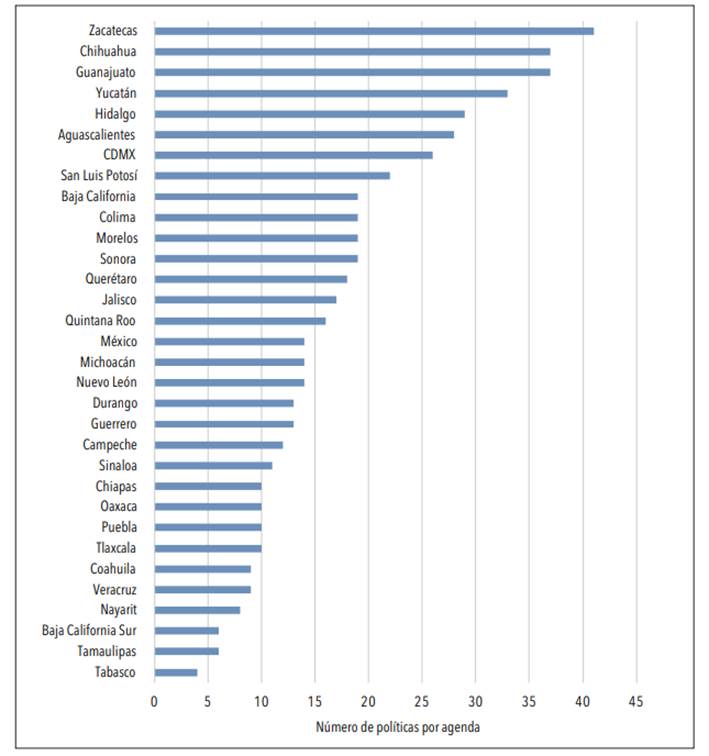 En los resultados destaca la variación en el tamaño de las agendas. Hay estados como Tabasco, Tamaulipas y Baja California Sur que únicamente formularon 5,33 políticas en promedio. En contraste, Zacatecas, Chihuahua y Guanajuato establecieron 38,33 políticas en su agenda local (figura 2). Sin embargo, los resultados del índice de Shannon muestran que los estados con agendas más diversas no corresponden a aquellos que formularon un mayor número de políticas (columna de diversidad en la tabla 1). Es el caso de Guerrero con 13 políticas, pero en ocho diferentes campos, al igual que Yucatán, con 33 políticas en ocho rubros diferentes. En cambio, Zacatecas limita sus 41 políticas a apoyos en alimentación y transferencias monetarias, las cuales representan 51,21 % de su agenda local. De manera semejante sucede en Chihuahua con 37 políticas: el 48,64 % de dichas intervenciones están centradas en esos apoyos en alimentación y en transferencias monetarias, por lo que la diversidad de su agenda resulta limitada.