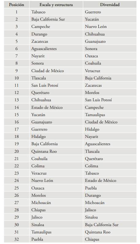 Las frecuencias relativas de las políticas de cada agenda local fueron utilizadas para estimar el índice de entropía de Shannon para cada uno de los 32 gobiernos. La escala y estructura socioeconómica de dichos gobiernos fue estimada mediante el promedio normalizado de sus recursos presupuestales, materiales y humanos. En ambos casos, los estadísticos resultantes sirvieron para ordenar los Gobiernos locales por rangos del 1 al 32, de mayor a menor siguiendo la estructura y diversidad de las agendas de políticas.