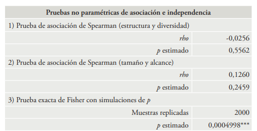 Utilizamos la prueba de asociación de Spearman para probar si los Gobiernos locales se posicionan en los mismos rangos ordenados al medir su tamaño y alcance de la agenda, y el índice de diversidad y el promedio de sus recursos, como medida de su escala y estructura. En otras palabras, el test prueba si (Si ) = (X'i ), promediado para cada i al estimar las fórmulas 1 y 2. La magnitud de las diferencias entre los rangos construyen un estadístico rho que se interpreta de manera semejante al estadístico de correlación de Pearson y cuantifica la asociación entre tamaño y diversidad.