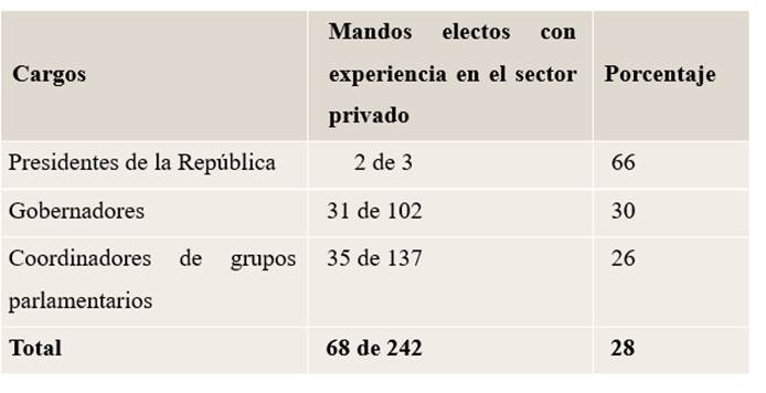 De los 102 gobernadores elegidos entre 2000 y 2015, 31 desarrollaron parte de su carrera en empresas privadas, es decir, casi un tercio. Esta proporción se mantiene estable durante todo el periodo, pero los representantes electos del sector privado están más presentes en algunos estados que en otros. Trece de los gobernadores pasados por el sector privado (42 %) son electos en los estados del Norte, 12 en los del Centro (39 %) y solo seis en los del Sur (19 %). Los líderes empresariales, por tanto, ganan con mayor frecuencia las elecciones en los estados altamente industrializados, y en particular en la región de Monterrey, que tiene una rivalidad económica con la Ciudad de México y es más dependiente de los Estados Unidos. La proporción de coordinadores de grupos parlamentarios con experiencia en el sector privado es menor. Dentro de los 137 senadores y coordinadores parlamentarios elegidos entre 2000 y 2015, solamente 35 han pasado por el mundo empresarial en el transcurso de su vida laboral. La proporción también se mantiene estable durante el periodo.