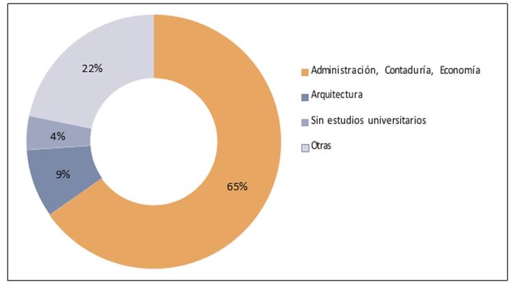 En el caso particular de los empresarios en cuestión, el saber económico neoclásico posee una enorme eficacia. Estos han adquirido carácter de sentido común, colocados por fuera de la duda o el cuestionamiento (Plotkin, Caravaca y Daniel 2018). Aquí, el reconocimiento de las trayectorias de formación de los entrevistados se vuelve central, teniendo en cuenta que más de la mitad de ellos (65%) han cursado o finalizado carreras de grado, especialmente atravesadas por el saber experto económico neoclásico -administración de empresas, contaduría, economía y disciplinas afines (figura 1)- . Aunque no podría afirmarse una relación directa entre las percepciones y trayectorias de formación, es posible señalar que el paso de los empresarios por carreras ligadas a la economía neoclásica habilita una circulación específica de esquemas de saberes específicos dentro de aquel universo.