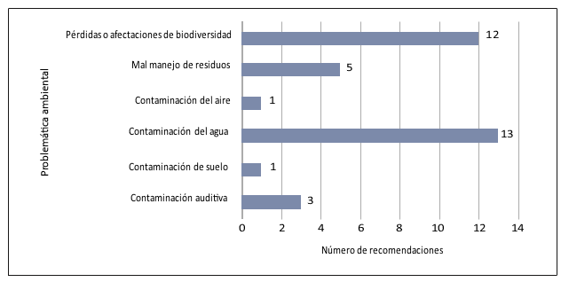 Se destaca que entre 2020 y agosto de 2022 la CEDHJ reportó 178 622 quejas por alguna presunta violación a los derechos humanos. Como se mencionó anteriormente, el derecho al ambiente sano tiende a encontrarse en los primeros lugares de los derechos violentados en Jalisco. Aun así, la CEDHJ tan solo emitió 35 recomendaciones que reconocen la violación a este derecho, así como a otros derechos relacionados con el mismo. En la figura 2 se exponen los problemas ambientales más recurrentes en Jalisco.