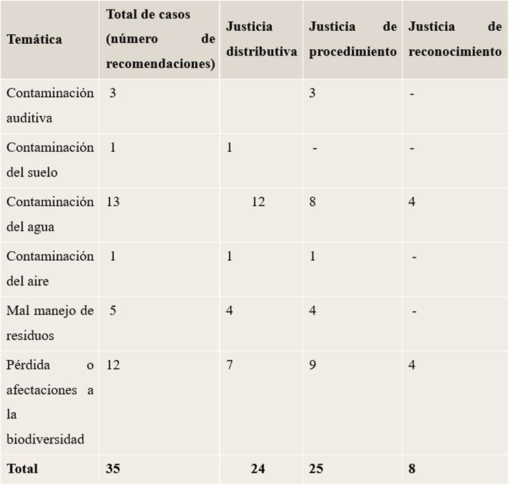 Las temáticas ambientales que se reportan en las recomendaciones de la CEDHJ se asocian a procesos de injusticia ambiental bajo la noción de justicia distributiva y de procedimiento. Esto indica que gran parte de las recomendaciones atienden casos de injusticia que resultan del impacto ambiental distributivamente desigual y de la falta de participación de las víctimas en los procesos de toma de decisiones. En los casos señalados como justicia de reconocimiento, la situación implica la invisibilización de grupos debido a una discriminación étnica, pues el impacto ambiental se da en territorios donde habitan poblaciones indígenas.