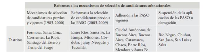 En Argentina, la selección de candidaturas a nivel subnacional está atravesada por la decisión provincial de adherirse o no a las PASO promovidas por el Ejecutivo nacional. La Ley de Democratización, de la Representación Política, la Transparencia y la Equidad Electoral (Ley 26.571/2009) reglamenta la formación de las alianzas transitorias y la presentación de candidaturas a fin de que la oferta electoral sea más ordenada y transparente, y que se regule de manera equitativa y democrática el desenvolvimiento del sistema de representación. En tal sentido, el mecanismo central para ello son las PASO. En estas se indica qué agrupaciones políticas están habilitadas para presentarse en las elecciones generales nacionales (aquellas que obtengan al menos el 1,5 % de los votos válidos emitidos en la primera vuelta); además define la conformación de la lista de cada espacio de forma simultánea mediante internas obligatorias y abiertas a la ciudadanía. Asimismo, actores políticos promovieron proyectos de adhesión en las legislaturas provinciales para incorporarlas a los plexos normativos electorales. Esta reforma se alinea con una estrategia de aplicación “de arriba hacia abajo”, pues primero se aplicó para la selección de candidaturas nacionales y luego se propiciaron leyes provinciales de adhesión.
