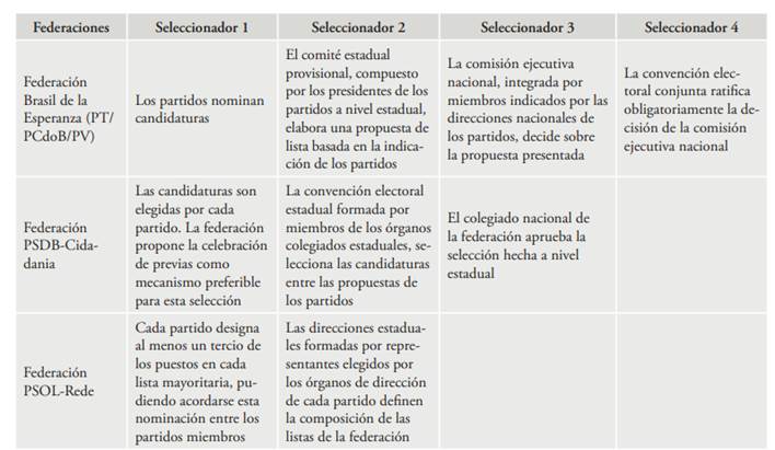 Se crearon tres federaciones para concurrir a las elecciones de 2022: la Federación Brasil de la Esperanza (formada por el PT, el Partido Comunista de Brasil [PcdoB] y el Partido Verde [PV]); la Federación PSDB-Cidadania (integrada por el Partido de la Social Democracia Brasileña [PSDB] y el Cidadania); y la Federación PSOL-Rede (compuesta por el Partido Socialismo y Libertad y la Red Sostenibilidad). Todas las federaciones tienen su propio estatuto en el que definen, entre otras cosas, las normas para la selección de candidaturas. La lectura de estos estatutos revela el carácter centralista del proceso respecto al rol de los liderazgos y a los órganos nacionales de los partidos (tabla 2) incluso cuando están unidos en federaciones, lo cual corresponde con la tendencia en el seno de las organizaciones partidarias. En general, se observa que los partidos tienen su autonomía preservada dentro de las federaciones en cuanto a la selección de candidaturas. Sin embargo, los líderes de cada partido en la dirección de las federaciones tienen la última palabra en la toma de decisiones.