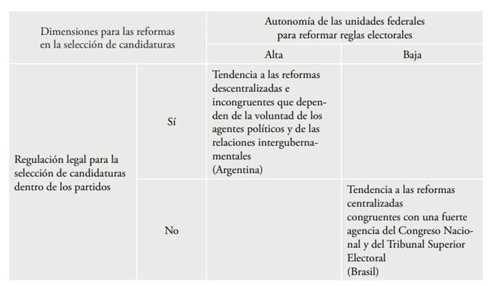 En la tabla 3 se ilustra un ejercicio de tipología de las reformas electorales, considerando las distinciones entre ambos países en cuanto al grado de autonomía de las unidades federativas y la existencia de una regulación federal para la selección de candidaturas.