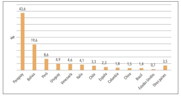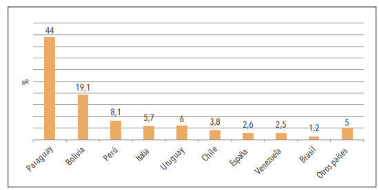 Frente a estas limitaciones, resultan interesantes los datos aportados por el RENAPER para caracterizar mejor el peso relativo de la población migrante bonaerense.4 Para agosto de 2022 el organismo estimó que el número de personas extranjeras residentes en la provincia con DNI digital ascendía a 1 411 097 (RENAPER 2022). Dentro de dicho universo, el 70 % está constituido por personas de tres nacionalidades: paraguaya (con amplia predominancia sobre el resto), boliviana y peruana, 80 como se muestra en la figura 1.