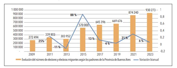 Ahora bien, para comprender estas variaciones porcentuales positivas del padrón de migrantes no puede soslayarse que en estos tres periodos gobernaba la provincia el peronismo kirchnerista, una fuerza partidaria claramente favorecida por el voto inmigrante bonaerense (incluso esta tendencia se mantuvo cuando el peronismo perdió la gobernación en las elecciones de 2015, sin embargo, obtuvo el 49,3 % de los votos en las mesas de migrantes). Aunque excede el propósito de este artículo, es preciso tener en cuenta este incentivo político-partidario a la hora de analizar el interés por consolidar e implementar políticas públicas segmentadas y focalizadas en materia de derechos electorales (Wellman 2020; Umpierrez de Reguero, Finn y Peltoniemi 2023).
