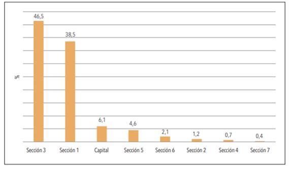 La distribución del padrón según sección electoral de pertenencia (figura 4), revela lo que se adelantó anteriormente: casi la mitad del electorado inmigrante bonaerense fija su domicilio en la tercera sección, que junto a la primera concentran el 85 % del total de personas extranjeras habilitadas para votar.