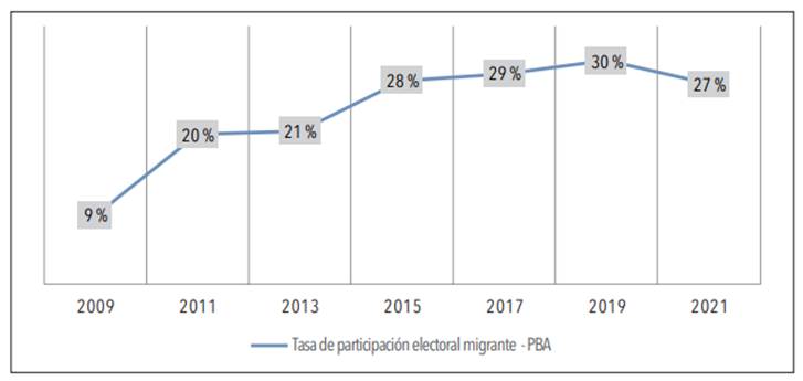 Debido al principio federal de la República Argentina, la elección de autoridades locales constituye una competencia reservada a las 23 provincias y a la CABA (distrito federal). En estos 24 distritos electorales se observan sistemas con alcances y requisitos diferenciados en materia de voto inmigrante. Sobresale el caso de la PBA ya que en ella no solo se concentra la mayor cantidad de inmigrantes del país, sino que además es la jurisdicción en la cual los derechos políticos de las personas migrantes tienen mayor impacto electoral (Alfonso 2016; Pacecca 2016; Penchaszadeh y Sander 2021; Penchaszadeh y Arlettaz 2022; Rodrigo 2023).Ahora bien, más allá de que el voto reviste obligatoriedad para la población extranjera residente en la provincia en pie de igualdad con la nativa, la participación electoral de los colectivos migrantes en la PBA (con un techo del 30 %) ha resultado históricamente reducida en comparación con la de los ciudadanos argentinos (80 % en promedio) (Ministerio de Gobierno de la de la Provincia de Buenos Aires 2020; Penchaszadeh y Sander 2021). Se trata de un aspecto que denota dificultades y limitaciones asociadas tanto a la constitución y actualización de los datos de empadronamiento (Alfonso 2016), como al nivel de conocimiento sobre los derechos políticos, los procedimientos y dinámicas implicadas y su ejercicio por parte de la comunidad extranjera (Defensoría del Pueblo 2022; Penchaszadeh y Sander 2021).