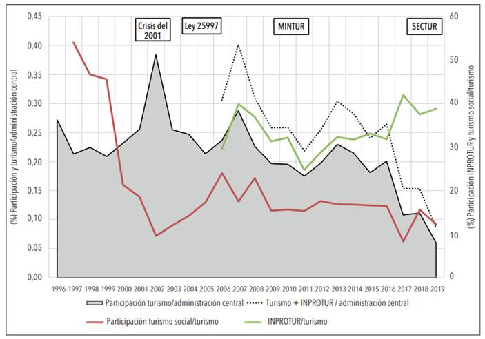 Dicho posicionamiento se tradujo en una fuerte asignación de recursos públicos. Desde entonces el INPROTUR se convirtió en el principal centralizador del gasto turístico (MECON 2006-2019b), en detrimento de otras áreas como el turismo social, que hasta ese momento ocupaban un lugar central en la agenda sectorial (Schenkel 2018). Para el Proyecto de Ley de Presupuesto 2020, el último presentado antes de la pandemia, el INPROTUR llegó a contar con el 82 % de los recursos totales asignados a este sector (figura 1).