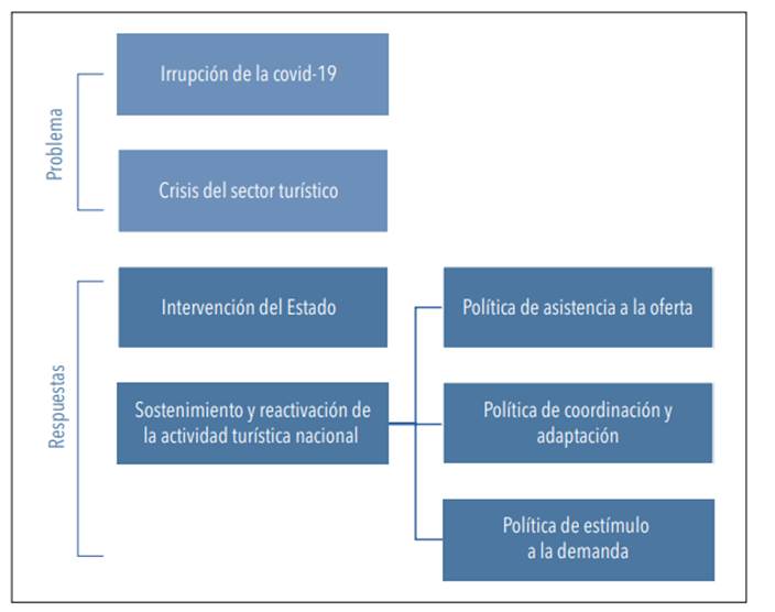 A partir de estos instrumentos, el Estado intervino en el sector con el propósito de sostener y reactivar la actividad turística nacional en tiempos de pandemia. Para ello, implementó varias políticas: de asistencia a la oferta en el contexto del aislamiento social, preventivo y obligatorio (el peor momento de la pandemia); de coordinación y adaptación para preparar el sector para la nueva normalidad en el contexto del distanciamiento social, preventivo y obligatorio; y de estímulo a la demanda originada por las primeras reaperturas para finales de 2020. Dichas políticas surgieron como respuestas a los cambios originados en la situación epidemiológica del país, a las recomendaciones sanitarias y a sus implicaciones en la actividad económica en cuestión (figura 2).