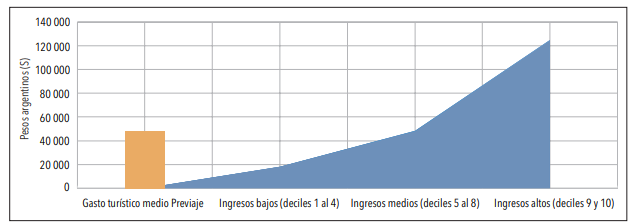 En cuanto al perfil socioeconómico del usurario, si bien el programa no registra información relativa a ingresos percibidos, se puede hacer una aproximación a partir del gasto medio efectuado, que, para la última edición fue de 48 000 pesos. Asimismo, el programa exigía una compra mínima de 10 000 pesos para acceder al beneficio, dicho monto representaba el equivalente a lo percibido por las familias más vulnerables a través del Ingreso Familiar de Emergencia (IFE) y, por lo tanto, implicó una barrera de acceso para una parte importante de la población, particularmente para aquella más afectada por la pandemia. Cabe destacar que para 2021 la Encuesta Permanente en Hogares determinó que el ingreso medio del estrato inferior (deciles del 1 al 4) equivalió a 18 127 pesos, el del estrato medio (deciles del 5 al 8) a 48 546 pesos y el del estrato alto (deciles 9 y 10) a 124 671 pesos (INDEC 2021a). Por lo cual el gasto turístico medio realizado con PreViaje se aleja del ingreso percibido por sectores de bajos recursos y se aproxima a personas de sectores medios y medio altos, las cuales disponían de la renta necesaria para costear el pago anticipado de sus vacaciones (figura 3).